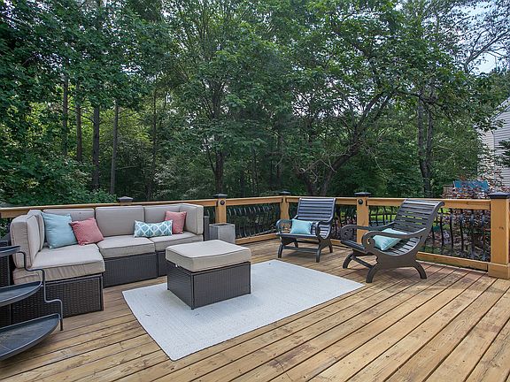 Downstairs master bedroom (2011 addition), could also be used as bonus room; hardi-plank siding; hardwood floors; 16 x 16 deck, patio, and fenced backyard bordered by wooded easement; granite counter tops and stainless appliances; 9-ft first floor ceilings; upstairs bedroom w/cathedral ceiling could be used as master; cul-de-sac in quiet northern Durham neighborhood.