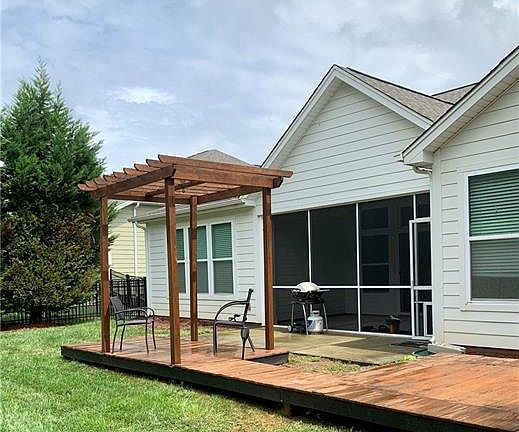 Three bedroom, 2.5 bath, plus study in the very OPEN FLOOR PLAN. House backs up to greenspace for complete privacy. Cathedral ceilings in all rooms. Master bedroom has a trey ceiling with ensuite bathroom and large walk in closet. Outdoor deck with pergola - great for entertaining. Fifteen minutes to uptown Charlotte and 5 minutes to downtown Belmont. Lawn maintenance is included in the HOA dues. Fiber cable is available for internet access. Community amenities include two pools, tennis courts, pickleball courts, bocce courts, walking trails, boat dock, and community center with exercise room.