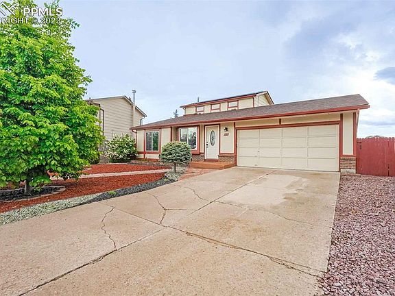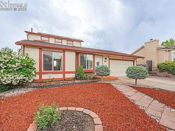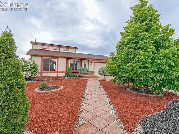 As the belle of the block, this home boasts a meticulously manicured front yard that delights with year-round pops of color and captivating landscaping. Be amazed as you discover the backyard view, which may even surpass the front yard's allure. The open space behind the home reveals breathtaking views of the Front Range and majestic Pikes Peak, which never fails to impress. The stamped concrete patio is a perfect spot to enjoy beautiful sunsets from this outdoor oasis and make use of the garden beds to indulge in your passion for gardening. Apple trees (Honey Crisp and Zestar) offer additional beauty and fruit to your backyard paradise. The shed provides storage, and the gate adds easy access to trails, nearby school, park, and playground. This home envelops you in warmth and comfort when you step inside. Hardwood floors welcome you into an inviting living room, creating an elegant and timeless ambiance. Beyond the staircase lies the well-appointed kitchen with counter seating, a dining space, and a cozy wood-burning fireplace. The main level offers easy access to a bright full bathroom that is flooded with natural light, thanks to the vaulted skylight. Adjacent to the bathroom is the spacious primary bedroom, featuring a walk-in closet. If you need extra space for hobbies or storage, a tiled bonus room can be customized to suit your needs. Whether you envision a secondary living area, a toy room, an office, or a home gym, this flexible space provides endless possibilities. The upstairs bedrooms provide comfortable spaces for guests, children, or anyone else who may need a private retreat. You'll enjoy the perfect indoor climate with a whole house fan and humidifier, not to mention the tankless water heater. Embrace sustainable living and enjoy the benefits of renewable energy with Tesla solar panels, which are fully paid for at closing. Don't miss the opportunity to fall in love with the charm of this home in person!