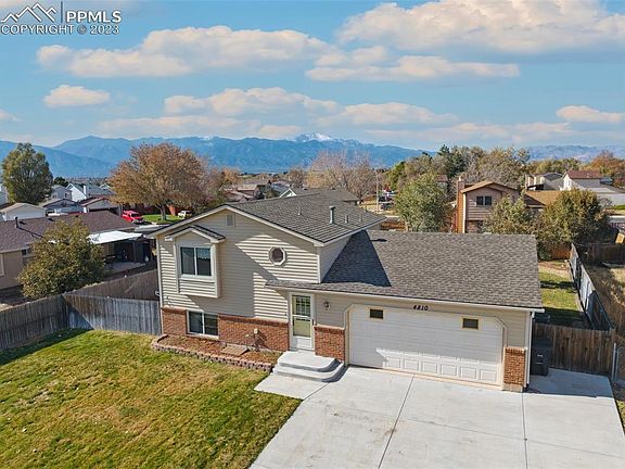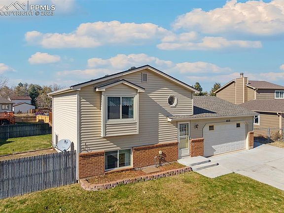 Don't miss this great home in a nice quiet neighborhood near Peterson SFB! This bi-level home has a wonderful floor plan that maximizes every inch of space. The upper level has a nice open feel that offers good natural light. The spacious living room adjoins and opens to the dining room with a sliding door that walks out to an amazing 12' x 18' maintenance free composite deck. With lots of room for your grill and outdoor furniture, this deck will become your favorite place to hang out and enjoy the fabulous views of Pikes Peak and those amazing Colorado sunsets! The large backyard (approx 36' x 73') has a well cared for lawn with an automatic sprinkler system, a large producing pear tree, and a 16' x 23' established garden area to grow your own veggies in the summer. The galley kitchen has solid oak cabinets and a reverse osmosis water system. Three bedrooms are located on the lower garden level of this home along with a 3/4 bath with an updated oversized shower. You'll enjoy the extra space in this attached garage which includes a 220v outlet and built in shelving, cabinets and workbench. The vinyl siding and composite deck are like new and provide for a low maintenance exterior on this home. A/C was installed in 2021. Don't miss this one - it won't last long!