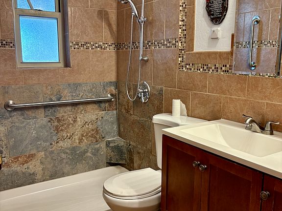 Shower seatCustom tile handicap-accessible bathroomDriveway gateNew water heaterNew wood laminate floorsGrab barsWalk-in shower