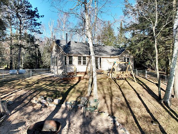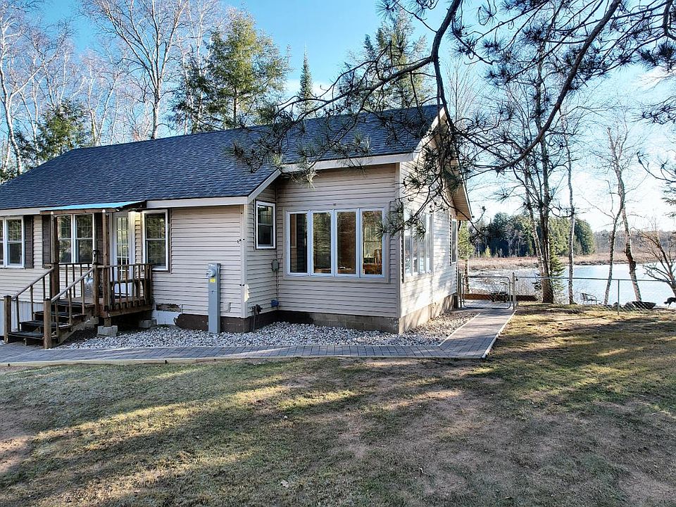SUGAR CAMP CHAIN - Discover tranquility at this lake cabin on 6 acres w 125 ft of prime lake frontage on Dam Lake, boasting a sandy swimming area and a new aluminum Floe pier. Dam Lake is full rec, providing 730 acres to explore before navigating to Sand Lake and beyond. Step inside to find a haven of comfort with 2 bedrooms and a fully renovated kitchen with modern appliances & finishes. The full bath features custom tile accents. Revel in the panoramic lake view through new windows and patio doors, creating a seamless connection between indoors and the breathtaking natural surroundings. Entertain effortlessly in the fenced lakeside yard, with deck and campfire area, for recreation and relaxation. Convenience is key with new barn door to access basement; store your vehicle or UTV! Whether seeking a retreat or year-round home, this property promises a lifestyle of serenity & outdoor enjoyment. New roofing, water heater, appliances, and includes furniture, Polaris Razer, plus MORE!