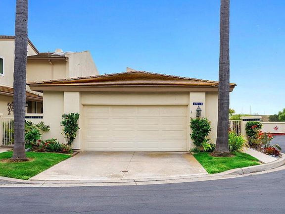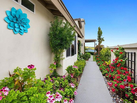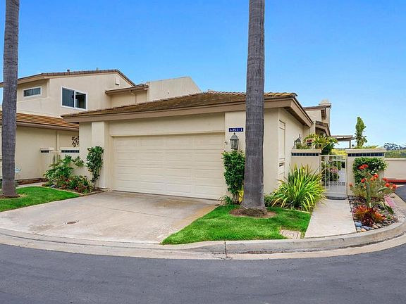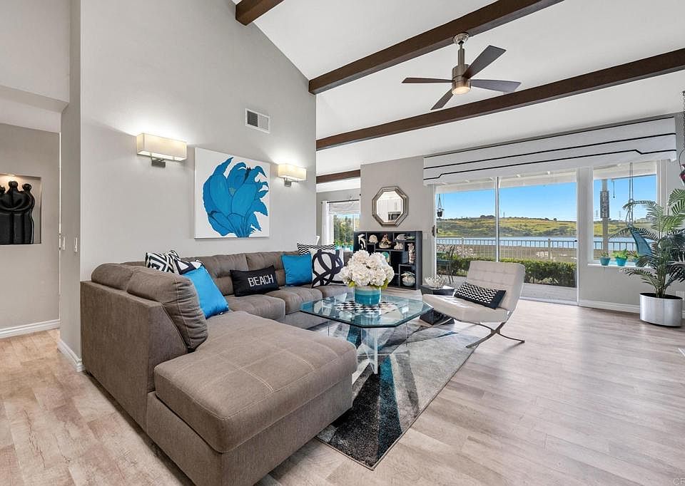 Looking for views?? This is it! 180 degree unobstructed panoramic lagoon views in Laguna Del Mar. This rarely available townhome boasts sit down views from living room, dining room, kitchen, primary bedroom and patio. Fully remodeled, highly coveted single story minutes from the ocean. Feels like a single family home with its own two car garage and a yard full of exotic, drought tolerant, rare plants and flowers. Covered patio with new tile floor. A chef's delight kitchen awaits, white shaker cabinets, granite counters, soft close cabinets, stainless steel appliances and large pantry. Both baths have been fully remodeled in designer style as well. Luxury vinyl plank flooring throughout. A well appointed primary bedroom retreat features barn doors, 2 closets with new mirrored closet doors and custom window coverings. Two car garage with work area and large overhead storage. Tiled atrium off second bedroom/office with peaceful secret garden. Three skylights, upgraded plumbing and electrical, and custom paint throughout. Cathedral ceilings have been embellished by added wooden beams. *Rare driveway large enough for one compact car plus 2 in garage. Corner lot which gives you extra southern exposure windows.