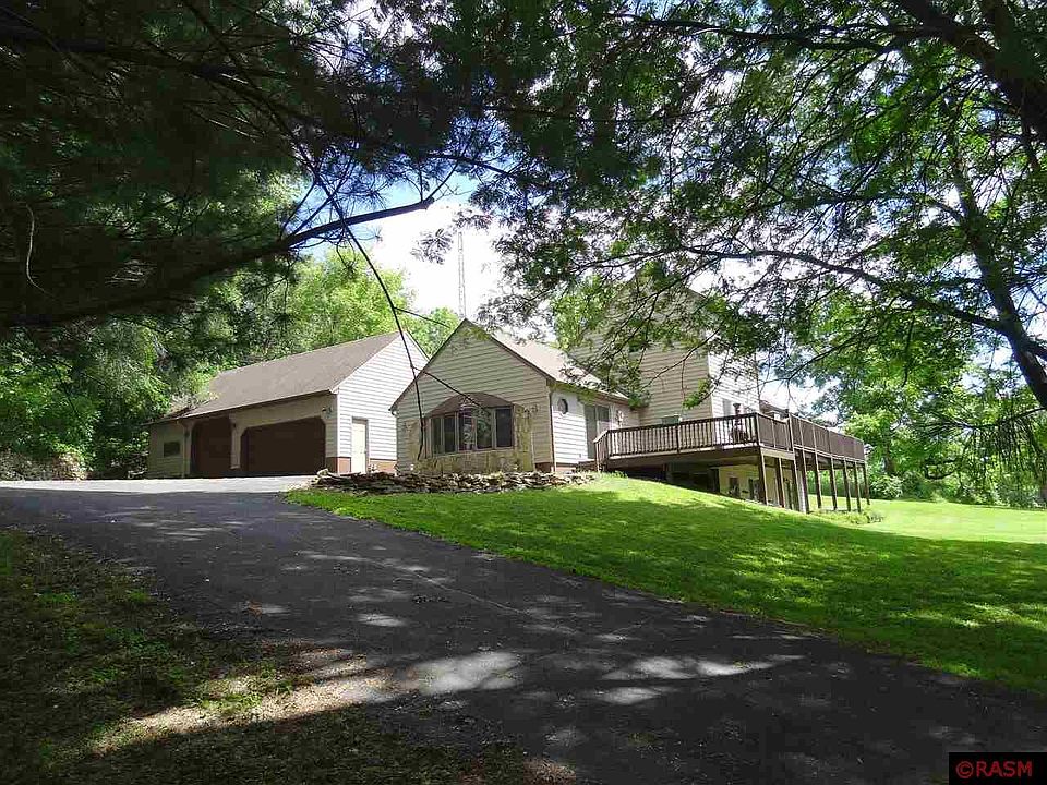 Rural property with loads of space for your enjoyment. Home features 4 bedrooms & 3 bathrooms, 2 kitchen & dining areas as well as 2 family rooms & living room w/vaulted ceilings floor-to-ceiling stone-faced woodburning fireplace. This home has been almost totally remodeled (flooring, kitchen counters & cabinet, new 6-panel oak doors, remodeled bathrooms on main & lower level. New stainless appliances in main floor kitchen. Main floor family room has large bow window and patio doors leading out to a large deck which runs across the entire front of the house. Walkout basement. 3+ car garage is insulated--concrete floor, large work area. Upper attic of garage is accessed by an outside walkway. Garage has 1 double garage door as well as 2 taller garage doors - can drive in one side & exit on the other side. Steel siding on home garage. Includes all appliances. Lot 19 us a saleable building site for possible building