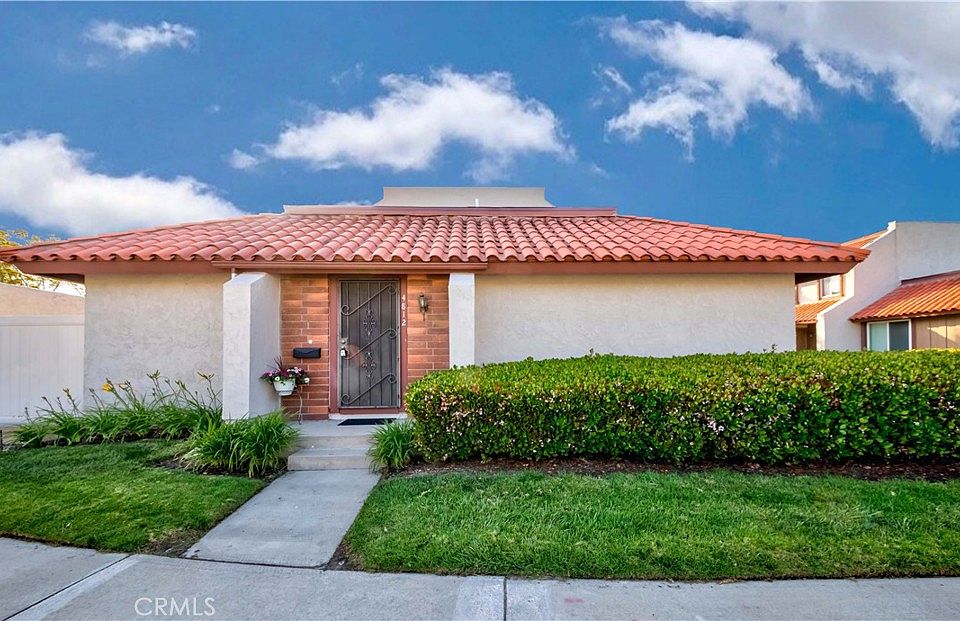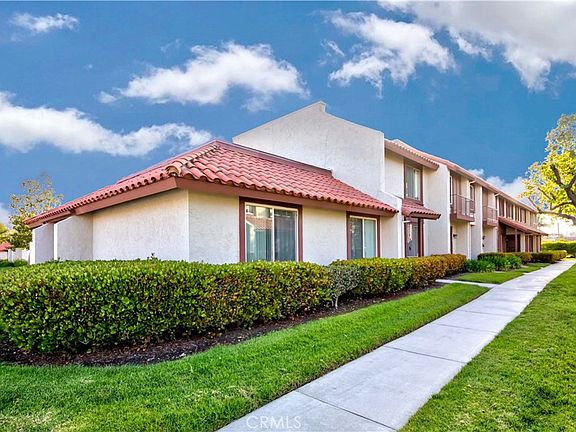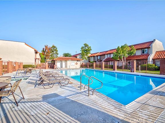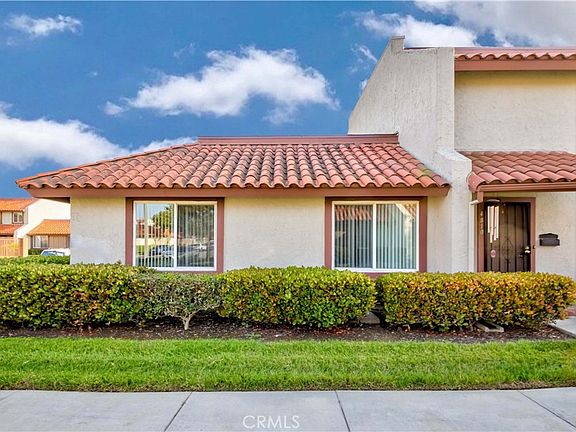 Highly desired one-story end unit in the community of Casitas California, Buena Park. This property features private living one adjoining wall provides privacy, resembling a standalone house, with a charming cement pavers patio leading to a two-car enclosed garage with laundry facilities, cabinets, and shelving. Parking for guests is conveniently available curbside at the front door. Recently remodeled kitchen with white cabinets, quartz countertops, and vinyl windows. Neutral tile flooring throughout, with faux wood flooring in two bedrooms. Newer central air & heating unit installed in the hallway. The bathroom features a large tiled shower with enclosure and a vanity with a granite countertop. The property also includes a solid wood shelving unit in the living room. Sunny Hills High School, Enjoy access to two community pools, a clubhouse, and gated RV parking.