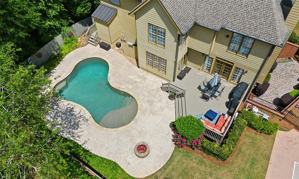 Nestled on a cul-de-sac with serene lake views, this stunning brick home is an entertainer's dream. * Enjoy summer cookouts around the PRIVATE PebbleTec gunite heated POOL, complete with a cozy firepit, tiki bar, full bath and personal basketball court. * The entrance boasts breathtaking two-story Palladian windows with leaded glass. * The main level features rich hardwood floors and a renovated chef's kitchen with stone and stainless steel finishes, a 5-burner gas cooktop in the island, breakfast bar, custom-built bookcases, plus coffered cherry ceiling in the living room, and a granite wet bar. * The kitchen seamlessly opens to the family room, centered around a gas log fireplace. * The owner's suite impresses with a tray ceiling, new hardwood flooring, and a renovated bathroom featuring an LED glass shower with color-changing lights, a soaking tub, mirrored lighting, and an oversized Hollywood-style custom closet. * Upstairs, the Jack & Jill baths provide private vanity dressing areas. * The full daylight terrace level includes a second kitchen, recreation room, gym, full bathroom, and steam shower. * Located in the premier swim/tennis lake community of Princeton Cove, with top schools: Garrison Mill Elementary, Mabry Middle, and Lassiter High.