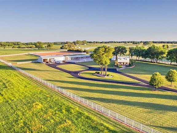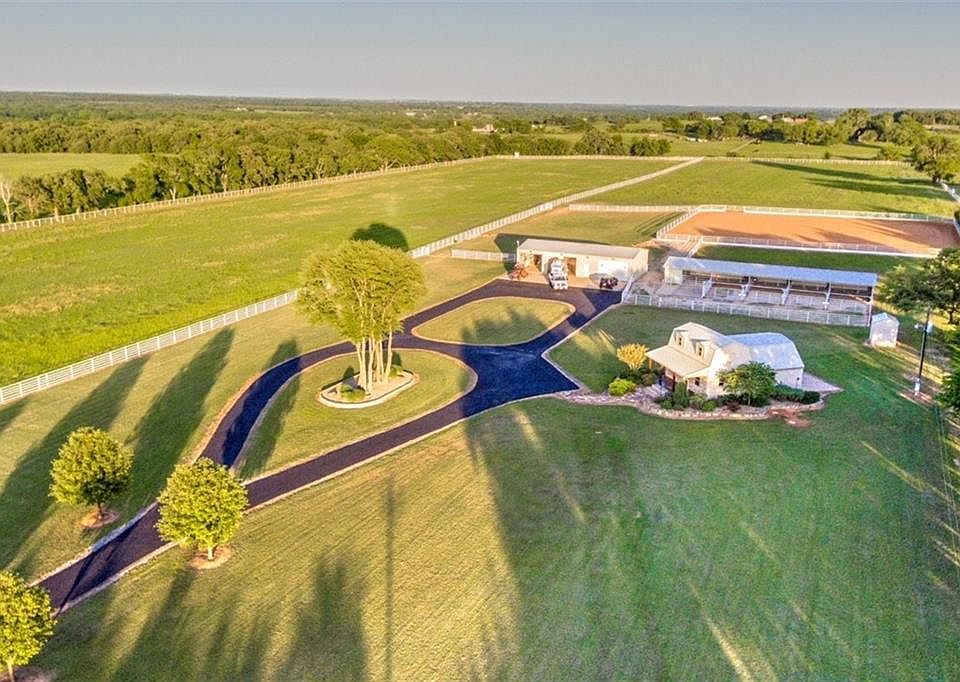 Immaculate horse property ready for move-in. Approx 20.9 acres. Lush pastures, pipe and rail fencing w cross fencing throughout. Asphalt driveway. Landscape lighting. Sprinkler system around house and barn areas. Hilltop arena 150 x 180 ft. Horse barn 24 x 94 ft with 8 x 24 ft tack room. Equipment barn garage 30 x 64 ft w 3-12 ft high overhead doors. Loafing shed on north 10 ac. 2,000 gal water storage tank. Water well 360 ft in Trinity River Aquifer, drilled in 2004. Flow 18-22 gal per minute. Pier and beam, stone facade house approx 1236 sq ft. Built 2004. Updated, remodeled 2014. LR, Kitchen, Upstairs Master, Guest BR, 2 baths, utility room. All electric. Seller does NOT own mineral rights.