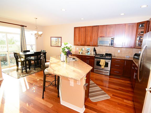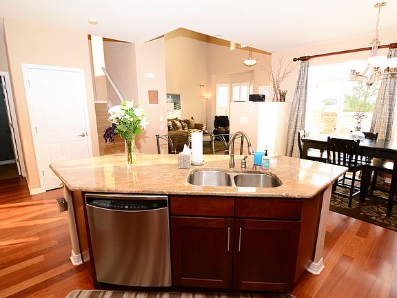 Gourmet kitchen with upgraded cherry cabinets, tile backsplash, slab granite counters throughout, stainless steel appliances. Master suite with private 5-pc master bathroom & walk-in closet. Upstairs loft. Secondary bedroom & full secondary bath. Amazing upstairs laundry with tile floors & cherry storage cabinets. Prewired for home theater. Upgraded interior paint & carpet. Community pool & tennis courts directly adjacent. Panoramic mountain view of the Flatirons and Longs Peak are unbeatable!
