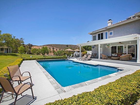 Award-winning schools and cooling ocean breezes are a hallmark of beautiful Bonsall. Boasting a world-renowned climate, the homes of North San Diego County in Southern California offer an outdoor lifestyle filled with sunshine. Conceived and constructed by the original owner/builder, this magnificent dwelling has good bones. Sited privately inside the gated community of Sweetgrass, this home rests on a verdant rise maintained by private water well. The grounds are park-like with an airy gazebo, abundant grassy fields for frolicking and an area just right for 2 horses, which are welcome here. Graced with a well-appointed outdoor kitchen, the glorious grounds boast an over-sized pool. A newly-constructed guest home nestles beside the RV garage, available in addition to an attached 3-car garage. Luxuriant space exists here. Within a large, enclosed lanai, whimsical spiral stairs give direct access between the sumptuous primary retreat and warming spa.