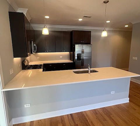 Discover modern elegance in this 3-bedroom, 2-bath residence located in a boutique newer construction building. Perfectly positioned within walking distance of both the CTA Blue Line and Metra, this home combines refined design with unmatched accessibility. A private elevator ride brings you to the expansive rooftop deck, an ideal setting for hosting guests or unwinding with skyline views. Inside, the open layout highlights wide-plank hardwood floors, abundant natural light, and a chef's kitchen featuring quartz counters and premium stainless-steel appliances. Each bedroom offers generous proportions, Enjoy year-round comfort with central heating and cooling, plus the ease of in-unit laundry. Step onto your private balcony to enjoy your own outdoor escape.