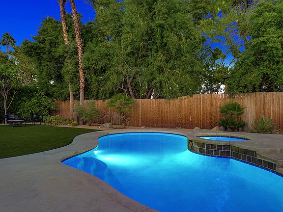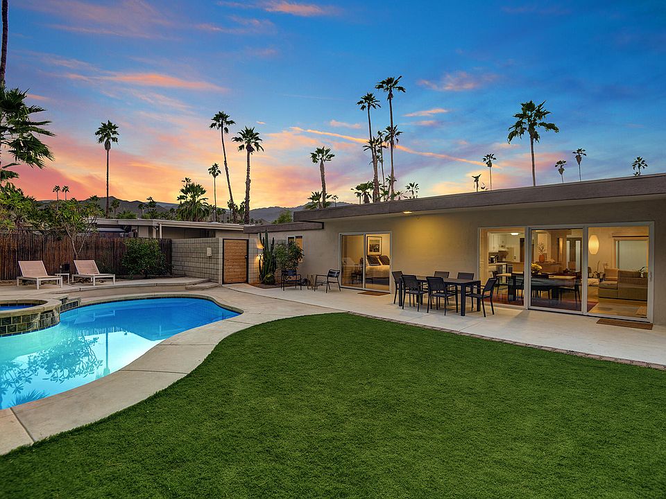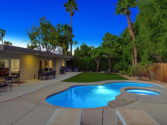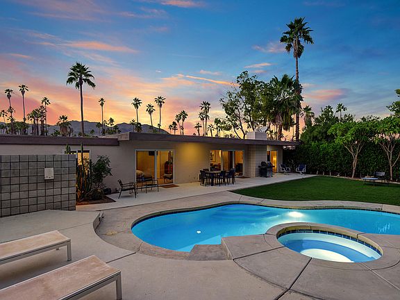''Indulge Yourself, Live Longer, Happier, Relaxed!'' That was Silver Spur Ranch's slogan, where some of the owners included: Bing Crosby, Phil Harris, Randolph Scott, Van Heusen, and JFK stayed during his visit. Located in the very desirable South Palm Desert, this picturesque neighborhood was developed in the '50s and featured modern-style ranch houses by famous Palmer + Krisel. This enchanted 1963 Mid-Century home is completely hidden behind the beautiful desert landscape, palm trees, and vibrant Palo Verdes. A delightful private and tranquil courtyard, behind the block wall + a decorative iron gate, welcomes you w/ soothing colors + nice pavers. At the foyer, you know this is the one. From the polished concrete flooring to the gorgeous fireplace w/its stone wall, sleek granite hearth, the wall of glass, incredible indoor-outdoor living, the beautiful landscape, makes this home very special. Almost 1,700 SqFt offering 2 En-Suite Bedrooms on the opposite sides of the house, plus an office/studio off the primary BD. A comfortable kitchen w/stainless steel appliances retain the charm of the era. Spacious and comfortable living space. A completely private, lush, and peaceful backyard w/ a pool + spa offers gorgeous Mtn views. Conveniently located adjacent to some of the most exclusive country clubs, El Paseo, the Living Desert, hiking trails, a highly sought-after GW Charter School, fine restaurants, Cafes, museums/galleries, Whole Foods, Gelsons, parks. A Lifetime Vacation.
