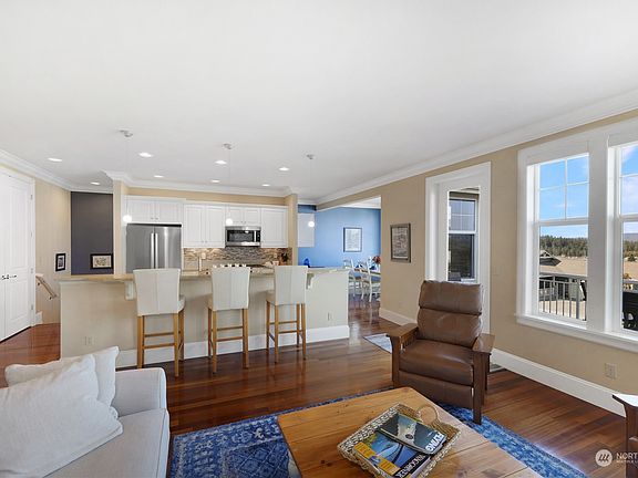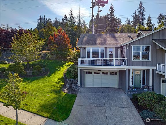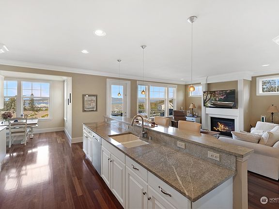 Quality shows in this beautiful home in lovely Portalis. Watch the ferries coming and going night & day, shipping and boating traffic and the spectacular views of the islands in this comfortable home where all the exterior maintenance is done for you. Perfect for boaters or travelers. Beautiful Brazillian cherry floors, crown molding, open spacious floor plan with large kitchen, dining and bar area and living room with gas fireplace. Large primary suite has private bath and walk in closet. Second bedroom and full bath complete the main level. Lower level features a second primary suite which could be used as a family or media room , laundry & 3/4 bath. Lots of storage, dbl garage, corner lot for privacy. Lovely immaculate home!