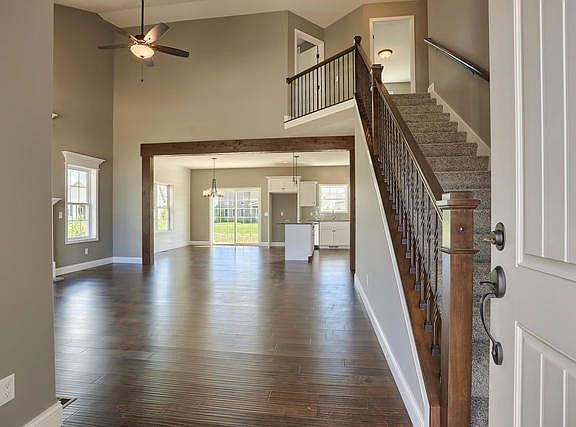 Beautiful new construction, with stone front, located in The Trails at Abbey Fields Subdivision. This 1.5 story home offers a total of 3,377 finished sq.ft., five bedrooms, and three and a half baths. Open floor concept with hardwood flooring throughout the living room and the eat-in kitchen with granite tops plus a large hidden pantry with a planning desk. The first-floor master suite features a walk-in closet and a private bath with dual vanities. Laundry room with lockers off of the 3 car attached garage. Three generous sized bedrooms and full bath with separate dual vanities complete the upper level. The basement is finished with a large rec/family room with rough-in wet bar, full bath, and 5th bedroom plus plenty of storage space. Don't miss out on calling this home!
