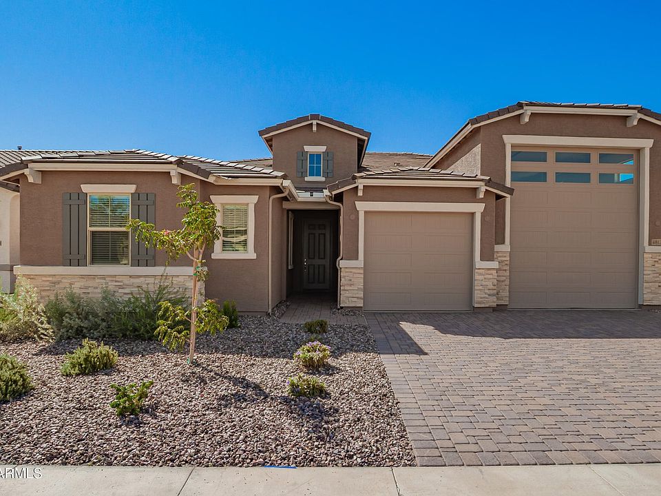 Experience the pinnacle of modern desert living in this brand new Deacon plan, where luxury and functionality meet in perfect harmony. Designed with both elegance and convenience in mind, this home features an impressive climate-controlled RV garage with air conditioning, plus two tandem bays ideal for adventurers, collectors, or anyone seeking versatile, comfortable storage. Step inside to an expansive open layout that exudes sophistication. The gourmet kitchen is a chef's dream, showcasing a walk-in pantry, crisp white cabinetry, sleek quartz countertops, designer tile backsplash, and premium stainless steel appliances. A large center island invites gatherings, while the space flows seamlessly into the great room and dining area, highlighted by oversized patio doors that extend your living space outdoors. The elegant primary suite is a private retreat, offering spa-inspired details such as dual sinks, tiled walk-in shower, and spacious walk-in closet. Thoughtful touches continue throughout, with a versatile flex room, mudroom, central laundry, and abundant storage options all designed to make everyday living effortless. Outdoors, enjoy an extended covered patio overlooking low-maintenance turf and desert landscaping, where mountain views provide a serene backdrop for relaxation or entertaining. With easy freeway access, this home combines modern luxury, convenience, and stunning natural surroundings, making it the ultimate retreat to call your own.