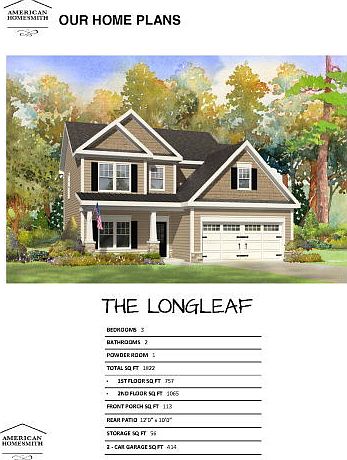 New Construction l The Longleaf Plan by American Homesmith in Island Creek l Two Story l 3 Bed l 2.5 Baths l 1822 sq ft per plan l Master Bedroom Upstairs l Granite Countertops l Stainless Steel Appliances to include Stove, Dishwasher and Microwave l Dining Room with Trey Ceiling l Kitchen Island with Bar Area l Laminate Wood Floors and Carpet l Vinyl Flooring in Laundry Room, Master Bath and Secondary Bath l Covered Front Porch and Rear Patio l Gas Log Fireplace l Walk-In Closet in Master Suite l Dual Vanity Sinks with Cultured Marble Countertops l Garden Bath Tub l Stand Up Shower. This home is new construction, dimensions and heated sqft are according to blueprint supplied by builder. Builder reserves the right to make changes to floor plan during construction.