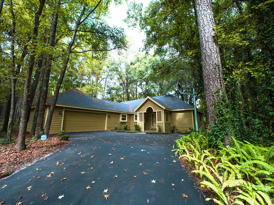 Very Desirable Laurel Park Home in award-winning Haile Plantation and situated on a quiet cul de sac. This 4 bedroom/2 bathroom split floor plan features a formal dining area, spacious living room w/ cozy fireplace and two new exterior doors overlooking oversized deck, separate laundry room with loads of storage space, and a galley kitchen easily can be opened up. The master bedroom has a large walk-in closet and opens to deck. Bonus second deck area is perfect for grilling. Over 60K in improvements overall. Brand new Hardie Plank Siding--all wood replaced ($25K) & the three new exterior doors add a cottage feel to this home. New roof in 2019. Laminate flooring for easy care. Great extended outdoor living space with oversized wood deck is perfect for entertaining large groups. Bonus gazebo was recently rebuilt & makes a perfect playroom/man-cave, or storage room. Two-car garage with plenty of storage space. Zoned for top-rated schools. Haile Plantation offers miles of jogging/walking trails, optional Golf & Country Club and within walking distance to the Haile Village. Laurel Park offers a community playground area steps and steps miles of trails. Taxes reflect non-homesteaded status.