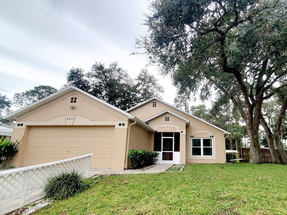 Welcome to your new home! This charming residence features 3 bedrooms, 2 baths, and a host of desirable amenities. The spacious interior boasts vaulted ceilings creating an airy and open atmosphere. The eat-in kitchen is complete with a convenient breakfast bar for casual dining. The master bedroom is a true retreat with its own private shower, large walk-in closet, and double sinks. Enjoy a cup of coffee or dinner in the large ,screened porch. The split bedroom plan ensures privacy and comfort for everyone. 2 car garage for ample parking and storage, fully fenced in backyard with shed for extra storage! Upgraded with a newer roof, Leaf Guard gutters, carpet, some windows and doors and new vanity in guest bath! This home offers easy access to shopping, Kennedy Space Center, Orlando Airport beaches and attractions. See this home today! You'll be glad you did!
