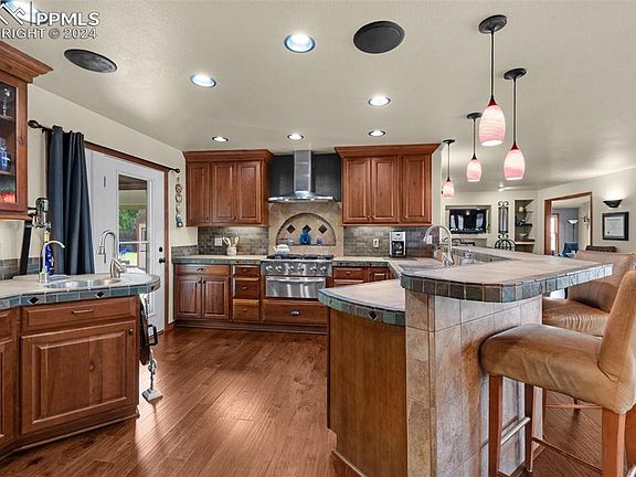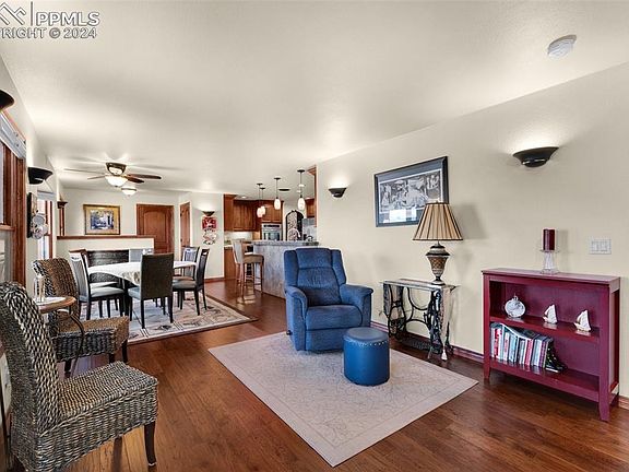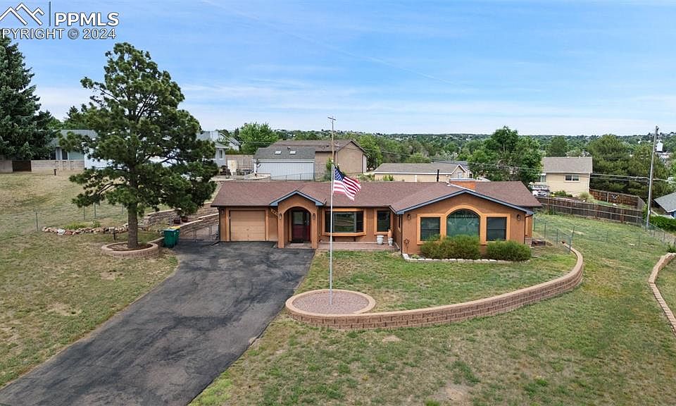 Views, Views, Views! Welcome home to this thoughtfully updated and well-maintained ranch style home in the highly desirable Park Vista Estates neighborhood. The lot is .5 acre and utilizes city water, rather than a well, which is common in the area. In El Paso County, NOT inside the city limits. Plenty of space for RV and guest parking on the property and the outdoor living space is serene, with INCREDIBLE Pikes Peak views from the front porch and looking out the bay window from the dining area. There is thoughtful landscaping near the home and a double gate to the backyard to allow for trailer or RV parking. Also recently added are dusk to dawn lights on the exterior. The kitchen is a chef's dream, with double ovens and double sinks, tile floors also a walk-in pantry, gas stove, newer refrigerator (plus an additional refrigerator in the garage that stays with the house). The kitchen walks out to the 15x15 fully enclosed sunroom to enjoy the private serenity of the back yard. There is also a family room/flex space with double doors and a gas fireplace, plus a new ceiling fan. This room also has lots of windows to let in natural light. Master Bedroom has a spacious walk-in closet, plus a walk out to the peaceful outdoor living space. The master bedroom also features an en-suite 4-piece bathroom with a large soaking tub. The laundry room is conveniently located between the master bedroom and the guest bedroom, with a 2nd full bathroom across the hall. New wood floors throughout plus vaulted ceilings make the space feel open and modern. Tankless water heater and furnace are located in the crawlspace. There is an automatic sprinkler system and drip lines for irrigation of the garden and raised flower beds.