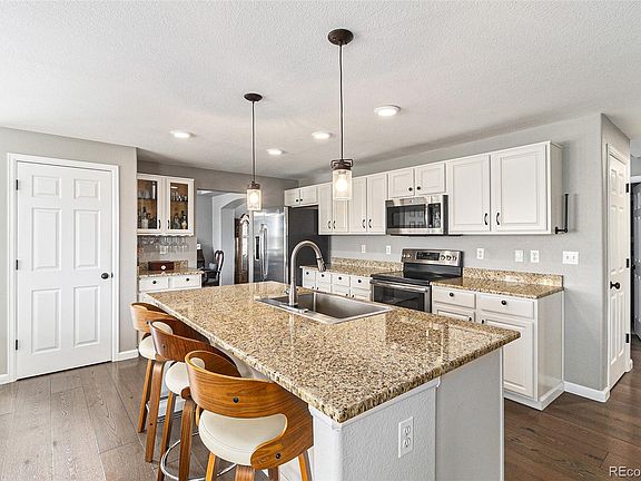 Welcome to this incredible 5 bedroom, 4 bath home backing to open space with majestic Mountain View’s on a quiet cul-de-sac street. Step inside from the recently expanded front porch into the inviting living room with high ceilings and formal dining room. The kitchen provides tons of storage space with ample cabinets and pantry, stainless steel appliances, granite counters, bar area, counter seating plus an eat in area. Open to the kitchen is the cozy family room complete with a custom wood wall and mantle with gas fireplace. Also on the main level is the office with glass French doors, laundry room with new washer/dryer, and a half bath. Upstairs has 3 bedrooms including the enormous Primary Suite where you can enjoy the mountain view. The 5 piece bath features dual vanity sinks, separate tub and glass enclosed shower and private toilet and walk in closet. The secondary bedrooms feature a convenient Jack and Jill full bath. Downstairs features an area used as a kitchenette for guests. There are two conforming bedrooms with a Jack and Jill bath and additional family room and storage downstairs. The fully fenced in yard is a showstopper with a stamped concrete covered patio, xeriscaped areas, playhouse for the kiddos, plenty of grass leading to the dedicated open space...and the views! There is also a large shed on a concrete pad for all your toys. Recent upgrades include a new high impact roof (summer 2024), oversized gutters, landscaping, concrete in the front, evaporative cooling system that complements the central air, new carpet. Mineral Rights (oil and gas) included, generating roughly $75-100/ month. Conveniently located off I25, central to Denver, Boulder, Ft. Collins, DIA.