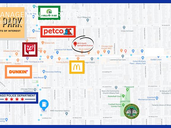 Located at 4815 N Springfield Ave in the 60625 zip code. You are in a prime locations which is close to Chicago North branch Trail, Highways entrances, Jewel, Aldi, Dollar tree, and so much more! You have a variety of restaurants to cater your cravings! This location is a 14 minute walk to the Kedzie Brown Line Train Station, and the 81 Bus Stop is on the corner!