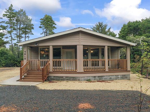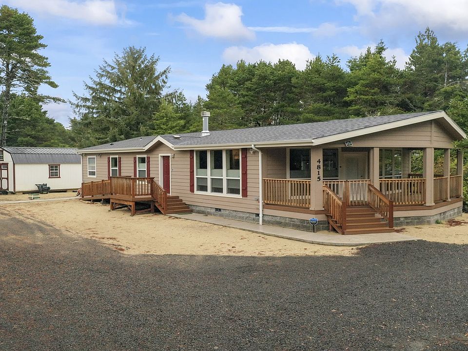 Your stellar new home is ready for move in! Built in 2021 and being sold with new furnishings. Living area with plenty of windows for natural light and lovely tree view. Recessed ceiling, vinyl flooring, fireplace in living room. Kitchen with granite counters, island, breakfast bar. Primary bedroom with walk-in closet, primary bath with dual sinks, soak tub. Large 8' covered deck. Side yard patio with wood fencing. 8X14 workshop. RV parking with hookups. Nestled in the beach area of Florence.