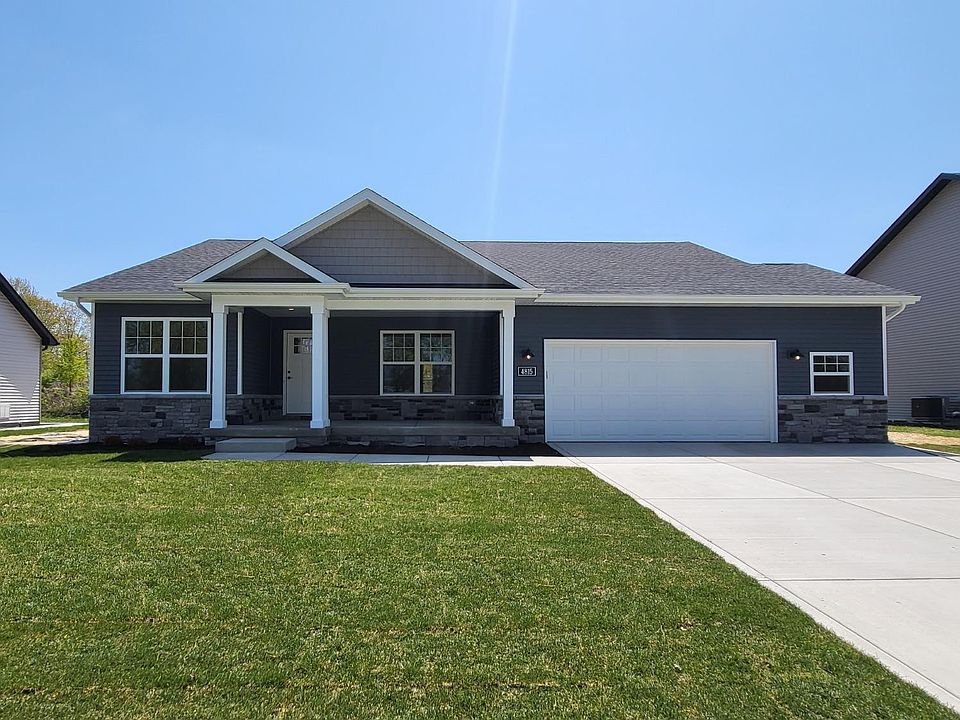 This is our JEFFERSON model. Features include open concept living area, great room with cathedral ceiling, spacious dining area, large kitchen offering center island, maple cabinetry, GRANITE, crown molding, soft close kitchen cabinet doors and drawers, pantry, stainless steel stainless dishwasher and microwave, main bedroom with bath, tray ceiling, and walk-in closet, two additional bedrooms, one flex room (4th bedroom or office), laundry room, QUARTZ in bathrooms, and black or brushed nickel lighting and hardware. Exterior features include vinyl & stone exterior, full landscaping package to include sodded front, seeded sides & rear, mulch/bush package, garage opener installed, and builder's warranty. Photos of a prior build.