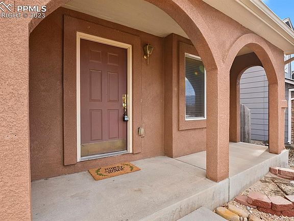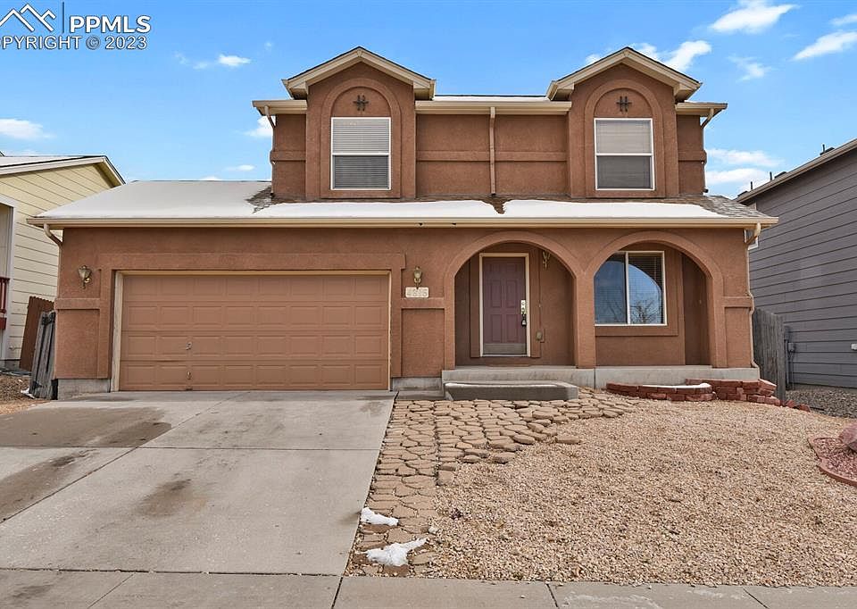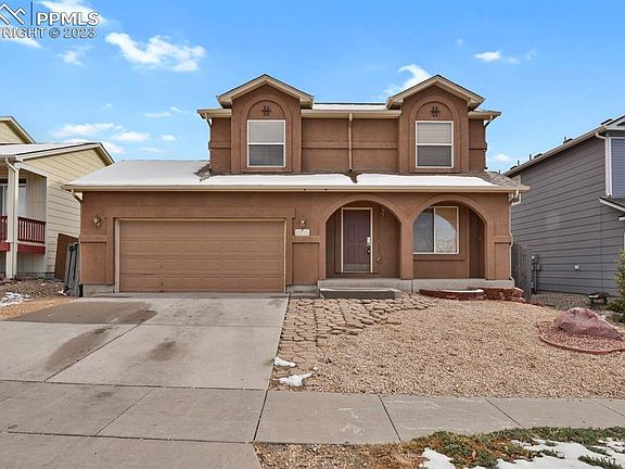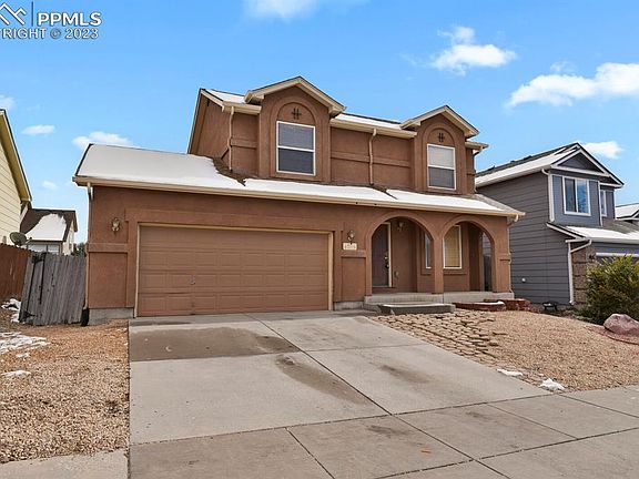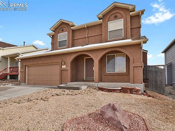Welcome to this two-story home in the Soaring Eagles neighborhood. Home has 3 bedrooms, 3 bathrooms, and a 2-car garage. This home is perfectly situated on a street across from the community park. As you approach the covered front porch and xero-scaped front yard you'll also have a stunning view of Pikes Peak, leaving you in awe. Upon entering the home, you're greeted by an open entry with a coat closet, and a living room featuring a gas fireplace with a tile surround and built-in shelving. The kitchen is spacious and open, featuring plenty of cabinets and storage, a pantry, and a dining area that opens onto the back deck. Rounding out the main level is a convenient powder bath and an adjacent laundry room. Venturing upstairs, the master suite awaits, complete with an attached master bath with a spacious soaking tub, a double vanity, and a walk-in closet. The upper level also offers two more generously sized bedrooms and a full bathroom. This home features an unfinished basement, with the freedom to design and finish this space to your liking, the possibilities are endless. The basement offers ample space and perfect for creating additional living areas, bedrooms, a home gym, entertainment spaces, or storage solutions, all tailored to your unique needs. This space presents an excellent opportunity to increase the home's value and expand your living area. Transform it into the basement of your dreams, adding instant equity and functionality to your home. Step outside to the spacious fenced backyard, featuring a sizable composite deck that's perfect for entertaining on those beautiful Colorado evenings. Don't miss the opportunity to make this Soaring Eagles home yours! It's conveniently located near trails, parks, dining, shopping, schools, military installations, and more. Schedule your showing today and experience the exceptional lifestyle this home has to offer.
