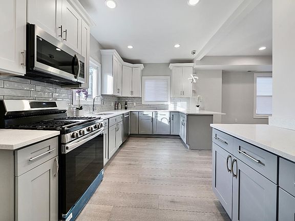 Gorgeous 4 bedroom, 2 full bath 2 story with main floor bedroom, coat closet, large LR/DR combo with recessed lighting that opens to kitchen. Almost everything rebuilt from ground up - New drywall, furnace, A/C, HWH, plumbing, electric, flooring, lighting, doors, vinyl siding, roof (4 years). Great kitchen with generous cabinets and quartz countertops, new SS appliances. Bathrooms beautifully done with ceramic tub surrounds, new vanities with quartz countertops. Stairs going up are oak with hardwood landing, handrail quartz (and oak). Increase square footage by completing the already partially finished basement with drywall ceiling. Garage completely rebuilt with new roof, overhead door and vinyl siding. Backyard has privacy fence. Make an offer. This stunning home could be yours for the new year.