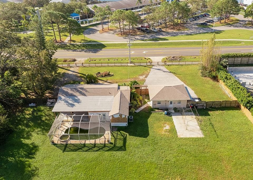 This amazing property sits on a RARE 1.5 acre cleared and fenced lot in the heart of South Sarasota. As you walk in the front door you will immediately feel at home with a massive great room offering endless possibilities. The room flows into the updated kitchen and makes it a great space for entertaining or cooking your family dinners. From the shiplap accent wall to the upgraded dark wood cabinets and modern appliances, this space is truly unique. You also have direct access to the pool deck through the windowed French doors. Down the hallway you will find a beautifully remodeled bathroom just across from one of the bedrooms. At the West end of the house, you have a spacious master suite which leads to an additional room that gives access to the pool deck. The third bedroom was being rebuilt (new owner to finish) with two more windowed French doors offering access to the pool and views of the massive backyard area. The oversized detached 2-car garage also makes for nice place to do your projects or store your things. There is even an air conditioned room that can be used as an office or for doing your laundry. This home is NOT in a flood zone, no HOA, and no deed restrictions, so bring your toys! The unique property is in a quiet area, yet close to all amenities including I-75, Siesta Key Beach, shopping, restaurants, and much more! Schedule your private showing today, it is priced to sell! Note: the new owner will need to do some finish work (drywall, paint, flooring, lights) in the new bathroom and third bedroom which were being built. There is a NEW ROOF + NEW AC as of 2021.