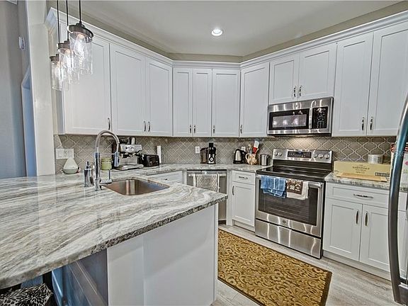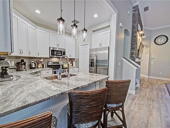 Why wait for new construction when you can buy now? This better-than-new unit in a gated community has been redone from baseboards to crown molding and everything in between. The flooring is all new, high quality laminate and tile in the master bathroom. Freshly painted walls are accented with chic designs (see photos of the master bed & bath and living room). New vanities in all 3 bathrooms and light fixtures throughout as well. The master shower was expanded into a double shower with new floor-to-ceiling tile and river rock floor. Enjoy entertaining in your open floor plan with new dove-tailed wood kitchen cabinets and countertop with ease as the appliances are only about 1 year old. The living room exudes style with a brick feature wall complete with decorative fireplace for peaceful evenings at home or impressing company. Upstairs is a large third bedroom with a half bath perfect for multi-generational living, crafts, or home office space. Impact glass windows and an AC that is only about 4 years (dual zoned) old round out the things to love about this amazing townhouse. The screened in lanai and extended paver patio overlook the community pond for relaxation and privacy. The community pool and picnic area with grill overlooks another lake. A fenced in playground is perfect for children and an open grassy area will please your pets; dogs welcome here! Very low monthly fees include water, sewer, trash, grounds maintenance and much more. Click the link for the virtual tour or schedule a showing before you miss your chance on this classy property.