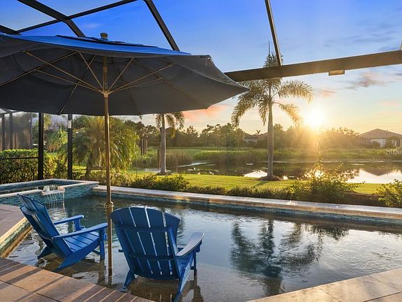 Welcome to 4818 Cabreo Court, a stunning Palazzio model in the coveted Esplanade Golf & Country Club. Perfectly positioned with sweeping pond and golf course views of the 8th hole, this home offers the ultimate Florida lifestyle with breathtaking sunsets, a panoramic screened lanai, remote-control lighting, and a resort-style heated pool. Professionally designed landscaping and reclaimed irrigation ensure year-round beauty. Inside, the Ethan Allen–designed interior showcases refined elegance with an open floor plan anchored by a gourmet kitchen featuring upgraded pantry shelving, dovetail cabinetry, a massive island, quartz counters, gas range, convection oven, coffee bar, and designer lighting. Tray ceilings, surround sound, and fresh paint enhance the living spaces. The primary suite boasts custom closets and a spa-like bath with an expansive walk-in shower featuring dual shower heads. Two guest suites—one ensuite—plus a large office and crown molding throughout add both comfort and style. The backyard oasis features an outdoor kitchen with fireplace, granite counters, and pocket sliders blending indoor and outdoor living. The newly refinished pool, sun shades, and hurricane-rated Kevlar protection provide peace of mind. Additional highlights include a spacious laundry with sink and quartz counters, and an oversized 2-car garage with epoxy floors and attic storage. As part of Esplanade Golf & Country Club, residents enjoy championship golf, resort pools, a wellness center, tennis, pickleball, fine dining, and vibrant social activities—all within a gated community in the heart of Lakewood Ranch. This exceptional property combines timeless design with modern luxury, creating the perfect retreat where every day feels like a vacation.