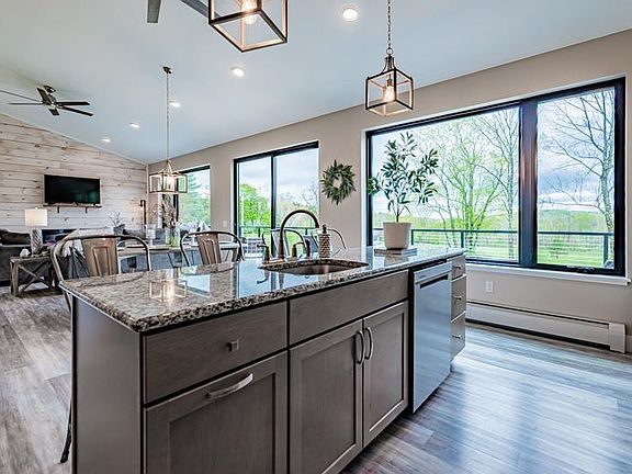 Built in 2021, this stylish 3 bed, 3 bath modern home sits on 9.8 acres with wide open views from every angle. Large windows and a wraparound Trex deck with sleek cable railing blur the lines between indoors and out, with access from both the living room and primary suite. Inside, the open layout is designed for today's living-featuring a gorgeous kitchen with stainless appliances, granite counters, soft close cabinets, a large pantry, and an island with seating for four. It flows seamlessly into a dining area and living space with an electric fireplace and wall mounted TV. The main level primary suite offers deck access, a walk in closet, and a spa style bath with double sinks and an oversized shower. Two more bedrooms and another full bath complete the main floor. The finished walk out lower level has its own entrance, lots of windows, a full bath, kitchenette, and great natural light-perfect for a guest suite, office, or content studio. Extras include high-efficiency HVAC, mini splits, a water filtration system, Kohler generator, and an attached 2-car garage. The home comes fully furnished with clean, modern pieces that are practically brand new. Just one mile from downtown North Bennington-so you're close to shops and amenities but still surrounded by quiet, space, and views. Please note: OPEN HOUSE IS CANCELLED