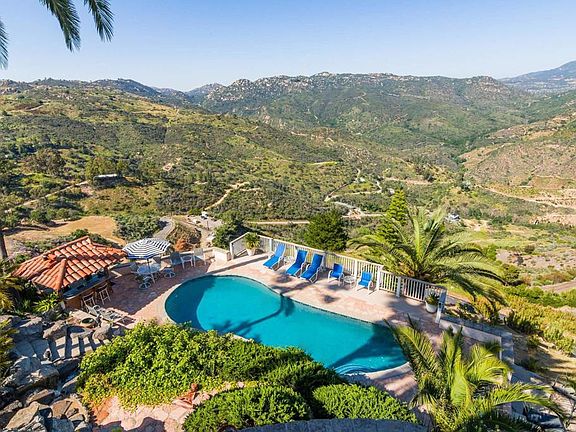 Gorgeous craftsman pool home on mountain top above the clouds w/ 360 panoramic views all the way to the ocean! Comprised of two adjacent 8+ acre parcels for a total of 16.77 acres (8.6 ac main lot, and 8.17 ac vacant lot w/ separately metered water & electric), this massive estate has a paid-in-full new Tesla solar system and is tucked into the private, secluded Rainbow community of Fallbrook surrounded by gorgeous views of the towering mountains, orchards & scenery. The attached vacant lot has an expansive flat area making it an excellent building site w/ its own separate water & electric utilities already to the lot, while the conjoining main lot includes a detached 1250 sqft 1 bed/1 bath guest house/ADU with a separate downstairs living area/office & kitchenette, in addition to the lavish 4000+ sqft main house. This one of a kind, stunning upgraded property is an entertainer's dream that feels like vacation with all the premium features & resort-style amenities you could want giving you every excuse to never leave. From the paid-in-full new Tesla solar system w/ a back-up battery & generator, to the zoned central heat/AC and surround sound audio throughout inside & out, no detail has been overlooked in this amazing oasis. Pull into the private gated driveway up to the main house with a tiled front porch entry, adobe-style fireplace and grand double-doors to soaring high vaulted beamed ceilings inside. The home's main level showcases beautiful Brazilian Cherry wood flooring, a full bed/bath, and a stunning gourmet kitchen w/ all the bells & whistles including refrigerated & warmed drawers, stainless steel & custom cabinet-covered appliances, granite counters & backsplash, a spacious center island, double convection oven, automatic faucet, breakfast counter and wraparound wet bar w/ wine cooler & additional cabinetry in the breakfast area that also boasts a two-way fireplace to the formal living room. Downstairs, the separate family room is the life of the party featuring a large lava rock wet bar & fireplace, built-in Category 5 surround sound media center, wine cellar w/ dual-zone Sub-Zero full-length wine fridge, remodeled full bathroom and a finished basement area w/ its own private entry that can be used as an additional bedroom. Sit back, relax & entertain in the home's sprawling backyard that truly feels like a high-end resort vacation that you never want to leave, highlighting a glass-enclosed full bar w/ seating, custom stone waterfall, sparkling blue pool, separate jetted spa, built-in BBQ, open & covered patios/terraces, exterior-access full pool bathroom, and a built-in fire pit– all enjoyed with a jaw-dropping panoramic mountain view backdrop. On home's the top level, the primary suite features an en-suite bathroom w/ dual sinks & a beautiful granite shower, private deck access w/ a luxurious a sauna, and private rooftop patio access for the best views in the house! Every level of the home also boasts wraparound decks w/ upgraded wood panel ceilings offering breathtaking views from every angle and all the way out to the ocean on a clear day, with the guest house also including a spacious attached deck of its own. Throw in the free SD Broadband WiFi, paddleball court, storage building and workshop, the features in this home are endless and impossible to list...this house is a must-see!