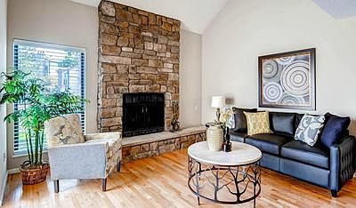 Impeccable, well-maintained townhouse features 3 full levels of ideal living space plus large, finished, garden level, walk-out basement with stone fireplace and outdoor patio. Basement may be used as a third bedroom or family room. Main level open floor plan living room and dining rooms boast nice hardwoods, vaulted ceilings and second, dramatic 2-story wood burning stone fireplace. Two bedrooms plus a loft/flex space are located on second level. Recently updated and freshly professionally painted throughout with new carpeting installed. Walk-in pantry and large picture window in kitchen lets in lots of light. Great deck off kitchen ideal for outdoor dining and entertaining with sliding glass doors for easy access. Nicely finished one-car garage with brand new door. Backs up to green area for additional privacy. Amenities include pool and tennis courts. Conveniently located close to shops, restaurants and access to Hwy 225.
