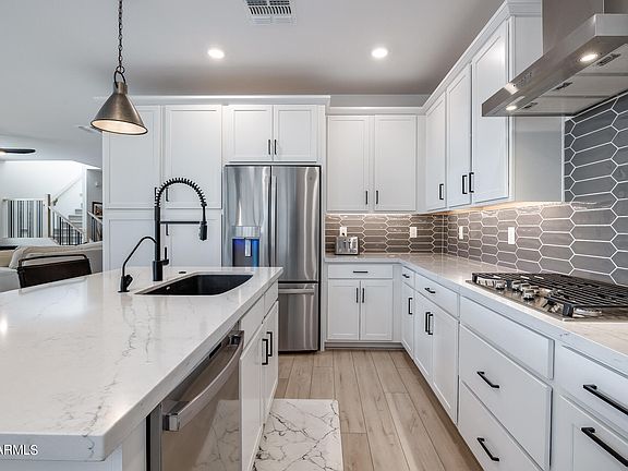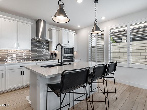 Fully upgraded and absolutely stunning! The gourmet kitchen has gas cooktop and chimney hood, wall oven and glass tile backsplash is gorgeous! Upgraded countertops, wood painted cabinets with pull-outs and soft close doors, under cabinet lighting and upgraded hardware through-out. This open concept home is perfect for entertaining with half bath located on the main floor for your guests. Fully finished backyard with pavers, covered patio and artificial turf. Backing to the Eastmark Great Park provides serenity and privacy. Upstairs 3 bedrooms surround the large loft and second living space. Primary bedroom with private bath is fully upgraded with walk-in closet, tile bathroom and shower. Move-in ready with over $86,000 in upgrades!