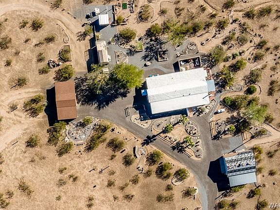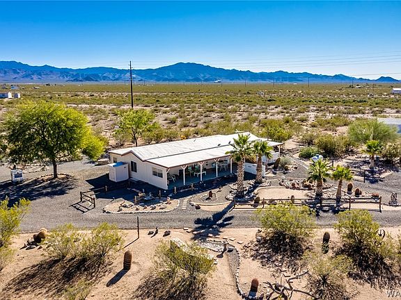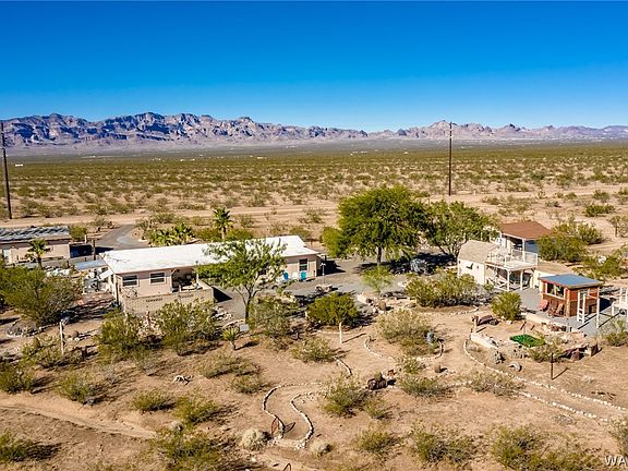 One of a kind property just off Historic Route 66 in Golden Valley, AZ! This is a two bedroom, two bath with well crafted, nicely finished, rustic style additions that make up a very comfortable and spacious home. Two car 20x28 detached garage (brand new roof that was being installed during photos) and a pair of Tuff Sheds that provide much more than just a place to store your belongings. The 12X16 Tuff Shed has mirrored 12x20 carports and the 10X12 Tuff Shed has a loft and a balcony that is great for star gazing. The 60X12 foot covered porch in the front of the home faces West to the Black Mountains and provides some of the best unobstructed sunsets Arizona has to offer. The nicely nestled, covered back porch provides views of the Hualapai Mountains that offer unmatched sunrise views. The home is situated on just under 5 acres (3 adjacent parcels all being sold together). You will have a hard time finding a more immaculate, unique, and loved property. The walking trails and thoughtful landscaping include gravel, rock, and many different trees that are incorporated into the natural vegetation which makes this property a desert paradise that simply cannot be replicated. This is a water haul property, but you wouldn't know it as the 2000 gallon tank is underground which is a benefit aesthetically, and keeps your water cool. This exceptional property is desert living at its finest.