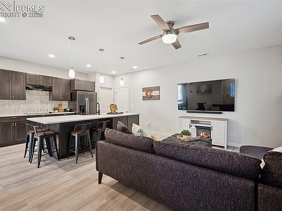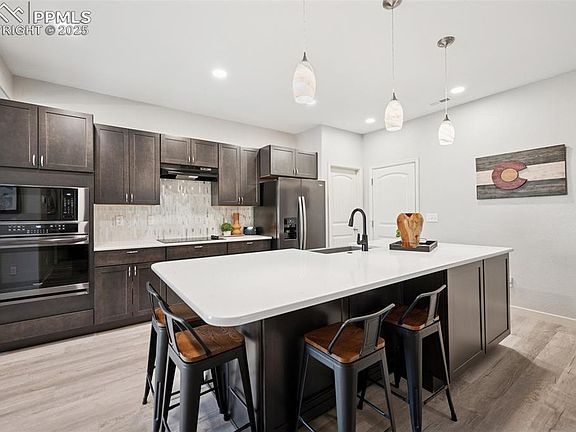 Amazing spacious townhome in a quiet gated community! This welcoming home was fully upgraded and updated in 2021! Your gorgeous home has 42" upgraded cabinets in the enlarged kitchen, with quartz counters, composite apron sink, upgraded faucet, incredible spacious and customized pantry and a huge island with cabinets on both sides! Newer luxury vinyl plank flooring through the main level, large dining space and a half bath on the main level! Upstairs you will find newer upgraded carpet and an absolutely massive private master bedroom retreat with views of Pikes Peak! The fully remodeled master bath has upgraded shower with tile floors, two shower heads, including one rain shower head and shelf/niche! The master bath also has two sinks, quartz counters, full wall tile behind the mirrors and separate toilet area. The secondary bedrooms are also very large with newer carpet and one has wonderful views of the front range! The upstairs also has a loft for family relaxing and a huge laundry room with space for a pocket office! All this with an attached two car garage that includes a 5' extension, gated and fenced private covered entry and grass area in front of your home! The community is nestled in a quiet area with pool, Clubhouse and work out area! The Clubhouse can be rented for private parties! Near the fun new shopping areas and easy drive to the military bases! This home has been lovingly upgraded and cared for and it shows! There is a half bath on the main level that is not showing in the black line drawings.