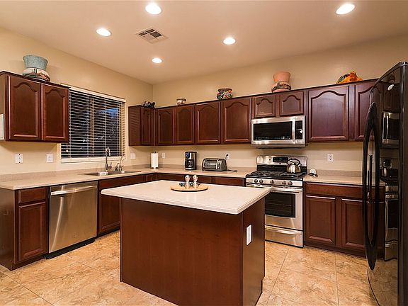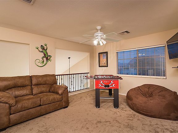 Welcome to this stunning Valley of the Sun home in Mesa, offering the perfect home away from home experience. Nestled in a serene and well-kept neighborhood with parks and plenty of paths, this spacious property features over 2,700 square feet of living space across two levels, high ceilings, and an amazing backyard oasis. The formal living space includes a couch, love seat, coffee table, and end tables, while the dining area boasts a high-top stone table with seating for six. The kitchen, stocked with everything needed to cook and entertain, opens up to the living room, creating a big open concept. The living room is furnished with comfort in mind, offering two leather recliners, a huge sectional couch, and a big TV mounted to the wall with cable. This home features five bedrooms, comfortably sleeping up to ten people. The main bedroom downstairs is perfect for privacy, featuring a queen-size bed, walk-in closet, dresser, and nightstands. Upstairs, the master bedroom offers a beautiful king-size bed, nightstands, dresser, and a big TV mounted on the wall. The oversized master bathroom includes a soaking tub, two-sink vanity, walk-in shower, and walk-in closet. The loft game room upstairs is perfect for kids or adults, complete with a foosball table, TV, bean bag, and love seat. The backyard oasis includes a heated pool, with solar heaters working from mid-April to mid-October, and a long extended patio offering plenty of shade, perfect for entertaining and dining outside. Parking is available with one space in the garage, driveway parking, and RV parking. No street parking is allowed, and guests must park in the garage, driveway, or RV gate. Only one garage space is available as the owner keeps one car in the garage. Located close to the 202 and all that East Mesa has to offer, this home is near area attractions such as Superstition Springs Retail Mall, Mesa Gateway Airport, Superstition Gateway West Shopping, Theaters and Dining, Usery Mountain Regional Park, Hiking Trails, Sunland Springs Golf Course, and Augusta Ranch Golf Course. Check-in time is at 3:00 PM and check-out time is 10:00 AM. Early check-in or late check-out cannot be accommodated, so please coordinate your travel plans accordingly. No pets or large gatherings are allowed. No smoking inside, outside the property, or on the premises, with a $1,000 fee billed to guests if there is any visual evidence or smell of smoke found upon check-out. The no-smoking policy includes the smoking of marijuana and vape pens. Homes are electronically monitored for noise and smoke detection. Utility caps apply, with overages charged for stays over 21 days. Guests must be at least 25 years of age to book, and the reservation holder must be present unless approved in advance.
