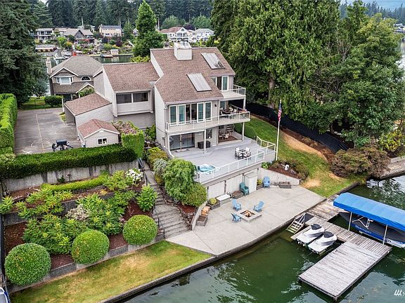 This private Lake Tapps waterfront oasis is the one you've been waiting for! Unobstructed open water views of the lake & Cascades are the backdrop from almost every room. This entertainer's dream home boasts large vaulted ceilings, windows & doors that provide immense natural light throughout. The main floor showcases the beautiful views with a large wrap-around deck. You will find another large entertaining Trex deck which features a built in hot tub & waterfall just off of the oversized rec. rm with wet bar. The top floor is an exclusive primary suite with its own private deck overlooking the water. The large 120ft lakefront patio features a large dock, firepit, covered boat lift & jet ski lifts for the best lake life enjoyment!
