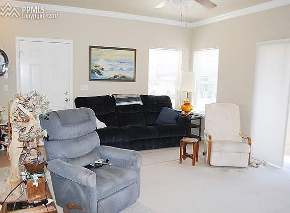 SPECTACULAR Pikes Peak and Mountain Views nothing is in the way of these awesome views. Total main level living, 1 step into the entry and great room living and dining areas with kitchen overlook. Top notch appliances with maple style cabinets with handles for easy open/close. Raised toilets, custom blinds, pre-plumbed for A/C, vinyl windows and stucco exterior. Right across from the pool and clubhouse. Closet organizers and all appliances stay. READY FOR QUICK CLOSE!!