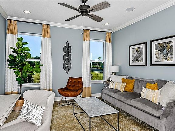 Under Construction. Located on a beautiful conservation home site within walking distance to the Amenity Center, this Antigua by Taylor Morrison is loaded with designer upgrades! The Antigua features 4 bedrooms, 3 bathrooms, flex spaces, an open kitchen with butler's pantry, and a 3-car garage. The gourmet kitchen comes complete with GE Stainless Steel gas appliances, painted white kitchen cabinets, Silestone quartz countertops, and Stainless Steel apron front kitchen sink. Enjoy tranquil views from the kitchen and dining area, which is open to a large gathering room, highlighted by triple sliding glass doors that pocket behind the wall and lead to your covered lanai with screen enclosure. Retreat to the spacious owner's suite with garden tub and an oversized shower with frameless glass enclosure. A huge owner's closet leads directly to the laundry room for ultimate convenience! Upgraded finishes include 18" tile throughout the main living areas, interior paint upgrade, 2" faux wood blind package, 5 ¼" baseboards, crown molding, tile backsplash in kitchen, and much more! Don't miss this unique opportunity to live in Artisan Lakes...it won't last long!! ****PHOTOS ARE OF MODEL, NOT ACTUAL HOME. Eaves Bend is positioned in rapidly growing Manatee County with an ideal location between Bradenton and Tampa Bay. With a short drive to stunning Gulf beaches, shopping, dining, entertainment, downtown St. Petersburg and Tampa International Airport, it also provides easy access to I-75 and employment corridors. Eave's Bend amenities include: resort style pool and hot tub, two-story clubhouse, fitness center and yoga studio, playgrounds and ball fields, dog park, and tot lot.