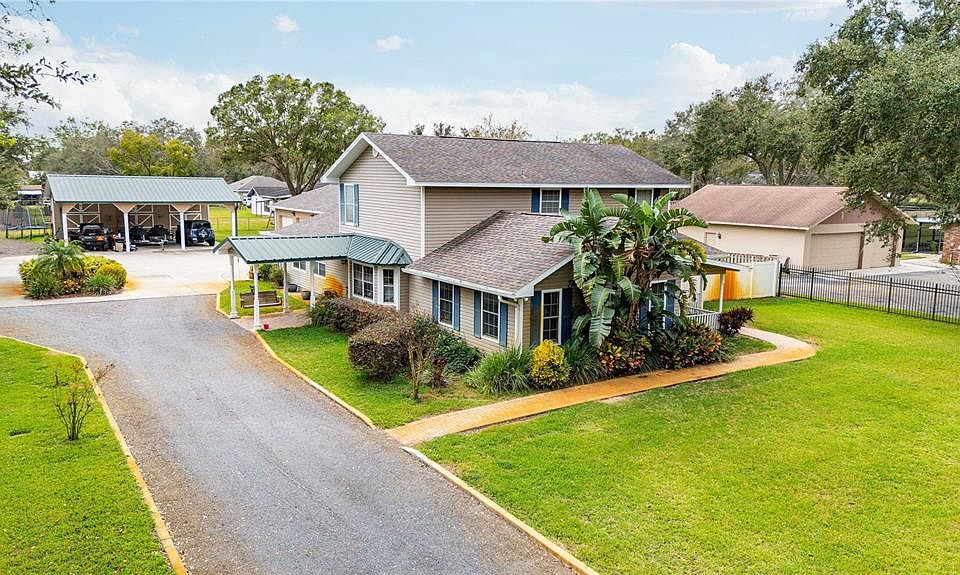 Welcome to this beautiful private home boasting a generous 3,200 square feet of living space on with 1 Acre of country living. Upon arrival you will notice the mature landscaping with a front porch to enjoy your morning coffee. As you enter the front door you will find a generously size family room with cathedral ceilings allowing for plenty of space to entertain. The eat in kitchen features granite countertops, stainless steel appliances, a functional island and solid wood cabinets. The sprawling, two story plan has a 3-way split allowing room and privacy for all. Upstairs are 3 bedrooms which all share a bathroom. Downstairs is an additional primary bedroom with walk in closet and in suite bathroom. The attached in-law suite features its own entryway, private walk-in shower, bathroom and bedroom. One of the most impressive additions to this home is the detached three bay pole barn, plus a detached 3 car garage with workshop space. Bring your boat, jet-ski’s, trailers, RV’s, and heavy equipment because this has room for it all. Completely fenced with an electric gate and ready for your animals! Additional access to the back of the property with another additional electric gate, the opportunities really are endless! There is no Homeowner’s Association or CDD to worry about. The relaxing front porch and screened in reach porch really bring home that country living feel. Despite the restfulness and charm this home has to offer, you are still zoned for the top rated Strawberry Crest High school. This home offers the small town feel, secluded mindset, while being just minutes from I-4, and only 30 minutes to Tampa and 45 minutes to Disney. Call today to schedule your private showing!