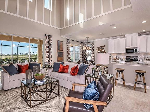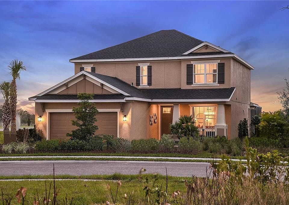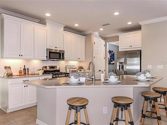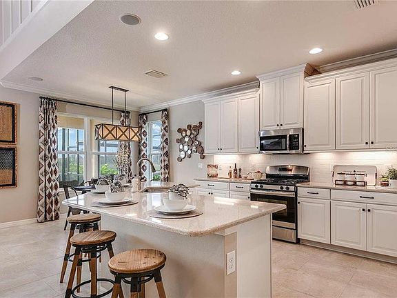 One of Taylor Morrison's most popular floor plans, the Bonaire features an open-concept with volume ceilings in the gathering room, and an owner's suite on the main floor. Upon entering the foyer, a formal dining room or flex space leads to the kitchen and casual dining area. An angled kitchen island offers plenty of seating and overlooks the two-story gathering room, making this a perfect home for entertaining guests! The 40' lanai with screen enclosure extends the entire length of the home. The spacious owner's suite on the main floor features large windows that look out onto the lanai, his and hers closets, separate water closet, garden tub and shower with glass enclosure. Upgraded finishes include cabinets, quartz countertops, subway tile backsplash, wood plank tile throughout the main living areas, and much more! Eaves Bend is positioned in rapidly growing Manatee County with an ideal location between Bradenton and Tampa Bay. With a short drive to stunning Gulf beaches, shopping, dining, entertainment, downtown St. Petersburg and Tampa International Airport, it also provides easy access to I-75 and employment corridors. Eave's Bend amenities include: resort style pool and hot tub, two-story clubhouse, fitness center and yoga studio, playgrounds and ball fields, dog park, and tot lot. PHOTOS OF MODEL HOME, NOT ACTUAL HOME.