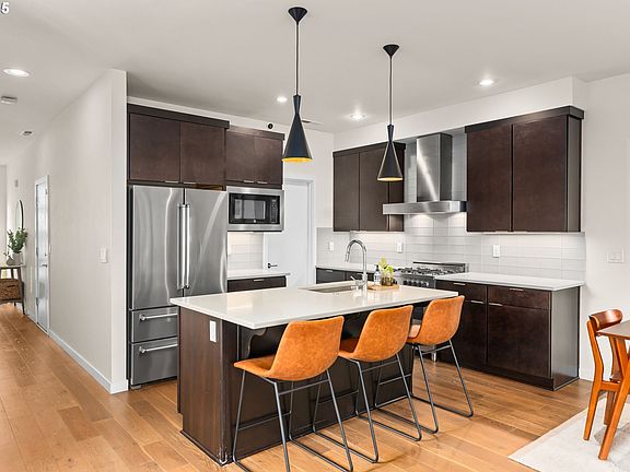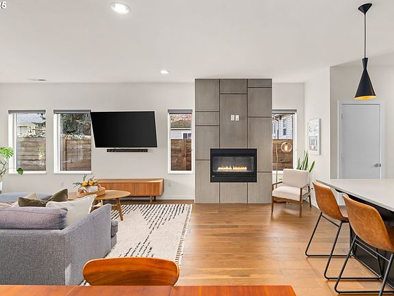 Easy Living! Enjoy the best of the vibrant N Mississippi District with dining, coffee, cocktails, ice cream & shopping. Light & bright interior with open floor plan & modern finishes. Gourmet kitchen featuring spacious quartz island with bar seating for 3 guests, stainless steel appliances, tile backsplash & large walk-in pantry. Expansive glass living room windows & adjacent cozy gas fireplace. Custom blinds & engineered hardwoods thru-out. Dining room seamlessly flows via glass slider to private & fenced outdoor space with newer patio pavers. Covered patio ideal for BBQs year round! Double doors open to the spacious primary bedroom suite ~ walk-in closet, tile shower/tub combo, double sink vanity & glass shower door with dual shower & 1 rain shower head. Convenient upstairs laundry room with sink & cabinetry. Frosted garage door & front door. Enjoy walks to Peninsula Park to visit the rose gardens. [Home Energy Score = 9. HES Report at https://rpt.greenbuildingregistry.com/hes/OR10185857]