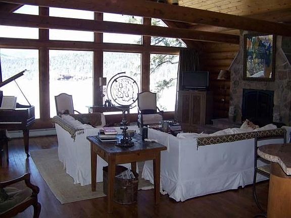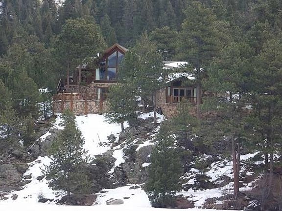 This 4 bedroom, 3 1/2 bath completey updated log & stone home is the best waterfront property in the Denver metro area, providing a unique Colorado lifestyle! The home takes advantage of stunning views of Evergreen lake and mountains in the distance! A private stone walkway leads from the house directly to the lake and path leading to downtown Evergreen! Stroll to the shops & restaurants in historic Evergreen stroll to the Lake House for summer concerts, or skating in the winter. The home's gorgeous open floor plan was comletely remodeled in 2006, and has every ammenity you can think of! Granite counters in the huge kitchen open to dining room and great room. Wide plank wood floors throughout lend to the ambiance of the Colorado lifestyle, complete with seperate living room and dining room on lower level. Enormous stone fireplaces serve as the center and gathering place of each floor of the house.The home's master suite is perfectly situated on the main floor, with another 3 bedroom and 2 full baths on the lower level. A separate guest house with galley kitchen, bath and balcony overlooks the lake with its own private balcony for guests, or it'll serve as a perfect home office.A large portion of the 1.7 acre lot is flat, perfect for playing, with a sprinkler system and built-in trampolene! A jacuzzi/spa overlooking the lake sits on the huge stone patio with picuresque lake views... perfect for enteraining. HOuse has stainless steel appliances, wet bar, sauna and art lighting throughout. The walls are hand painted and glazed by a professional designer providing that one-of-a-kind luxury, yet rustic ambiance. The house is 4658 square feet and the guest cottage has 300 square feet. This is a MUST SEE! (Internet 5670064-4/5/2012)