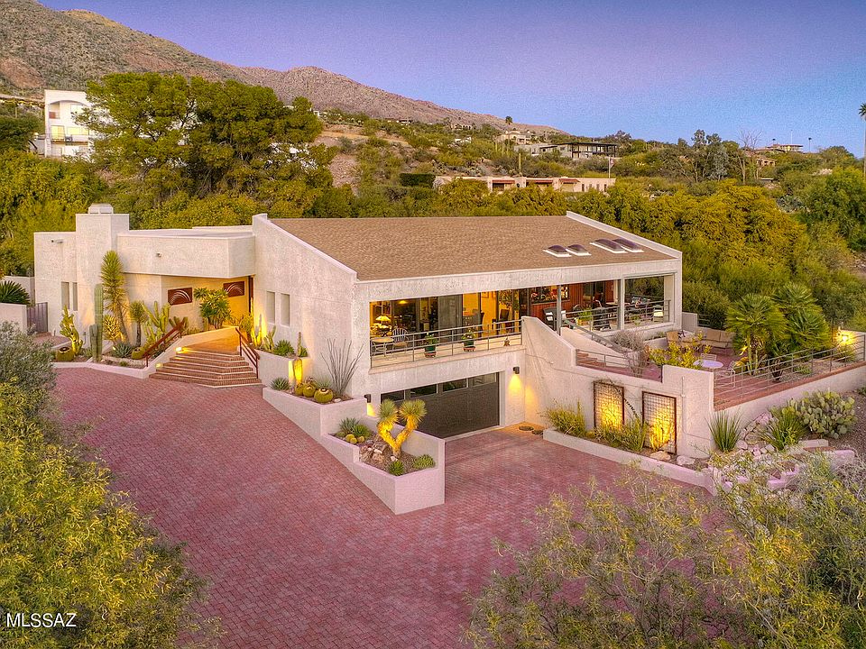 ''Custom contemporary home, designed by renowned Tucson architect Earl Kai Chan, on 1 acre at the end of a cul-de-sac in Skyline Country Club Estates. 3 large bedrooms, 3 full baths and a spacious den/office/library. Completely updated in 2016, with gorgeous kitchen remodel, huge island, quartz countertops and Thermador appliances. Floor to ceiling windows and doors capture stunning mountain and city views. Spacious master suite with large spa-like bathroom and huge custom closet. Low care landscaping with mature exotic succulents and trees. Large outdoor patio and kitchen, beautifully designed for year around entertaining. Professional landscaping surrounds an updated sparkling heated pool and spa, situated for maximum privacy and stunning views of the Catalinas.
