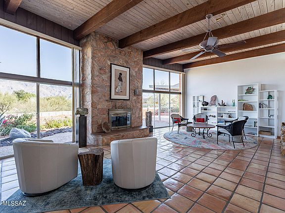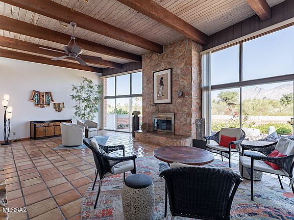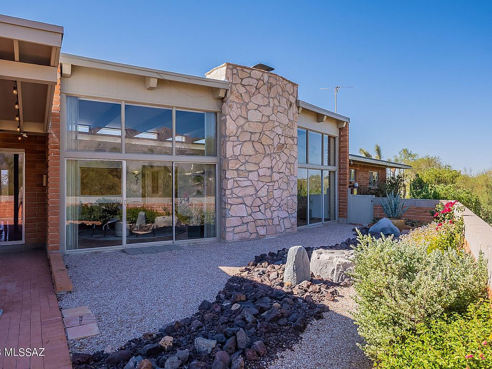 Mid-century modern burnt-adobe beauty, updated in all the right places. Prime Foothills location on an elevated lot w/panoramic views of the city & mountains. This home has it all; bright & sunny solarium, living room w/ soaring exposed wood beam ceilings, floor to ceiling rose stone fireplace & wall of windows perfectly framing the Catalina Mtns, OWNED SOLAR & detached 512 sq ft workshop. Kitchen has been updated w/new countertops, cabinets & backsplash. Outside home & workshop painted in 2022. 2x1,500 gallon water harvesting tanks & seamless gutters installed. Roof work done Oct. 2023 w/2 year warranty. **Seller will offer up to $15k of seller concessions toward closing costs or credit toward new windows/door w/approved offer - see attached bid under documents** Meticulous natural landscaping w/native trees and cactus gardens. Close to river walk, Foothills schools, shopping, recreation, restaurants & more. Location is the perfect blend of foothills living with easy mid-town Tucson access. THIS PASSIVE SOLAR SOLARIUM is a Very Special Feature of the House: Minimize or eliminate the need to have the heater on During the late fall, winter and early spring when it is cold and sunny but when the solarium gets warm, open the front and bedroom doors and windows to the solarium and the warm air will flow in and moderate the temperature of the house. Doing that will eliminate or minimize the time needed to have the heater on and it will moderate the temperature throughout the house. Minimize or eliminate the need to have the A/C on. During the late spring, summer and early fall when it's warm to hot but the humidity is not at its highest, close the white curtains in the solarium and turn on the evaporative cooler. Then open the front and bedroom doors and windows to the solarium. Also open the windows a little in the rooms at the back of the house that you would like cooler. Doing that will eliminate or minimize the time needed to have the A/C on and it will moderate the temperature throughout the house.