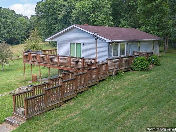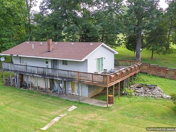 Quiet, 5-acre farm, close to town! This two-bedroom, two-bath home has been in the same family for 50 years. It needs some TLC, but it has a LOT of potential! Large, open kitchen; full, unfinished, walkout basement (with a full bath, wood stove, and room for two more bedrooms); wraparound deck overlooking a fish pond; roof is only 3 years old; plenty of mature trees; and several out buildings. Galvanized steel 50x100-foot pole barn with electricity, 3/4 concrete floor, woodworking/carpentry area, and work benches. Detached, 1-car garage (with attached horse stall) has electricity, outside water hookup, wood stove, work benches, concrete floor, and fluorescent lighting. Metal fence posts mark the property. Back field is partially fenced; front field is baled for hay every year. Great for animals, or to sell locally. Kitchen appliances and washer/dryer remain. Buyer has right to inspections, but seller is selling AS IS. Square feet is approximate; if critical, buyers should verify. Cash or Conv. only