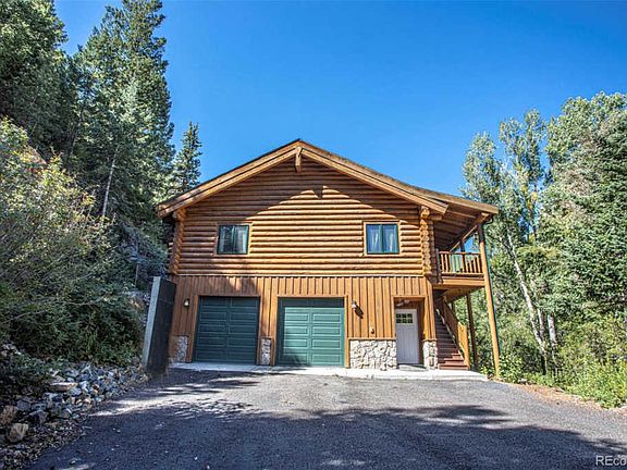 Wow - iconic Colorado log home on a beautiful creek-side setting. So quiet and private yet very easy access on a paved road and only 7 minutes to I-70 or town Idaho Springs. The living room has vaulted ceilings, skylights, completed with wood burning insert to a stone fireplace and log mantle, a dining area, a large kitchen complete with granite countertops, stainless steel appliances, and a butler's pantry. The master suite is large with a walk-in closet and a 5 piece bath. An office/studio and half bath complete the main level. The lower level houses two additional bedrooms, a full bath, and a home theater or bonus room. Beautiful slate floors on the lower level. The deck overlooks the creek and nice garden area below. Hot tub on the deck to stay warm and enjoy the views. The over-sized two-car garage has plenty of room for all your toys. Only a 25-minute drive to Echo Mountain Ski Resort. New solar panels . Easy to show.
