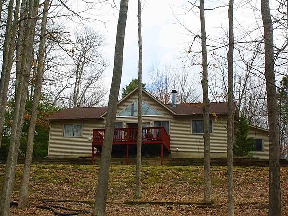Enjoy wilderness, comfort, lake views and privacy with this great home located in White Birch Estates. This 3 Bedroom 2 bath home is located right in the heart of the Estates and has 85ft of Water frontage! You can enjoy the view of the lake from a large deck off the back of the home. Inside the home features a large living and kitchen space with vaulted ceilings and open concept with fireplace. Home also has an attached garage, large bedrooms, and all on 1.50 Acres. There are two additional rooms in the home for storage. One is located right inside of the garage and is HEATED. Could be used as a workshop. Updates include: New Septic System, Roof, and Furnace